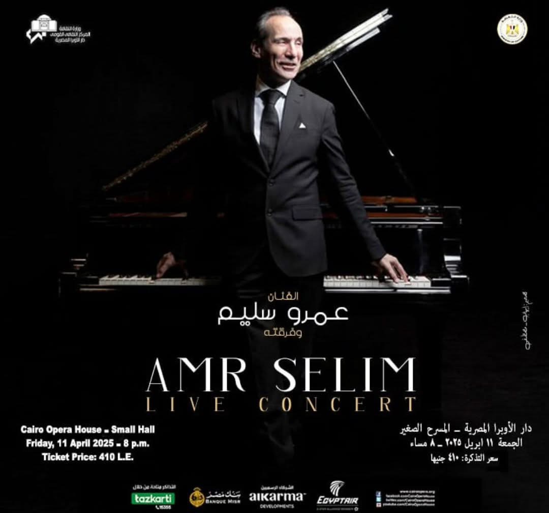 ضمن فعاليات وزارة الثقافة تقيم دار الأوبرا المصرية برئاسة الدكتور علاء عبد السلام حفلاً للموسيقار وعازف البيانو الشهير عمرو سليم وفرقته فى الثامنة مساء الجمعة ١١ أبريل على المسرح الصغير .