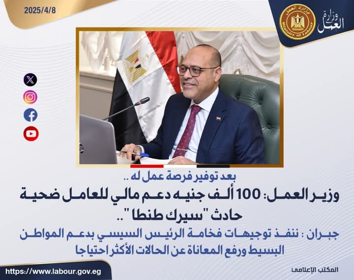 وقال الوزير جبران أن هذا الدعم يأتي في إطار تنفيذ توجيهات فخامة الرئيس عبدالفتاح السيسي رئيس الجمهورية ، بالتواصل والاستجابة السريعة للحالات الأكثر احتياجا ،بتوفير الدعم الرعاية والحماية ..وقال مدير مديرية العمل بمحافظة الغربية أحمد القللي أنه قام بتسليم هذا الدعم إلى العامل الضحية، وتنفيذ كافة تكليفات وزير العمل بالتواصل مع هذه النوعية من الحالات الطارئة التي يتعرض لها أي مواطن ،وأوضح أن الوزير كان ينسق مع السيد المحافظ في كافة الإجراءات التي بدأت بتوفير فرصة عمل لائقة له ،وزيارته بشكل مستمر في مستشفى الطوارئ الجامعي بطنطا للاطمئنان عليه ،وايصال رسالة بأن المواطن البسيط دائما في اهتمامات القيادة السياسية .