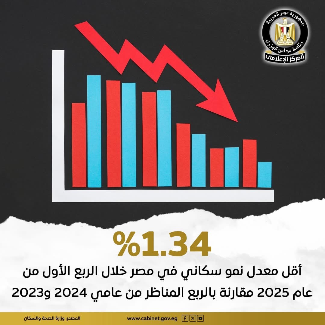 تسجيل أقل معدل نمو سكاني في مصر خلال الربع الأول من عام 2025 بنسبة 1.34% مقارنة بـ 1.4% في الربع المناظر من عام 2024، و1.6% في الربع ذاته عام 2023.
