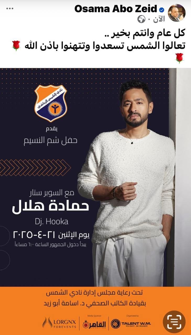 أعلن الفنان حمادة هلال، إقامة حفل غنائي ضخم بمناسبة احتفالات شم النسيم في نادي الشمس بالقاهرة، وذلك يوم ٢١ أبريل الجاري.