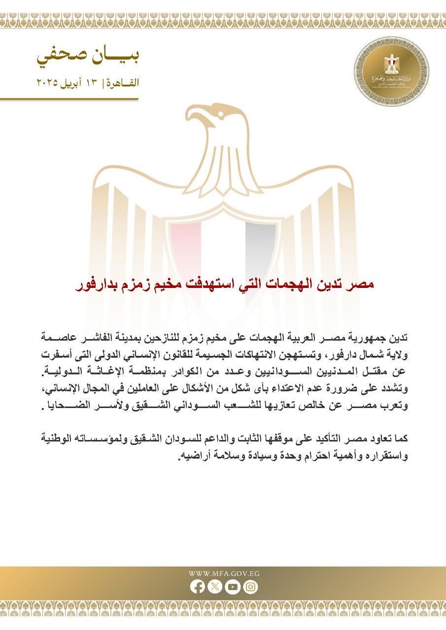 أدانت جمهورية مصر العربية، الهجمات على مخيم “زمزم” للنازحين بمدينة الفاشر، عاصمة ولاية شمال دارفور، واستهجنت الانتهاكات الجسيمة للقانون الإنساني الدولي التي أسفرت عن مقتل المدنيين السودانيين وعدد من الكوادر بمنظمة الإغاثة الدولية.