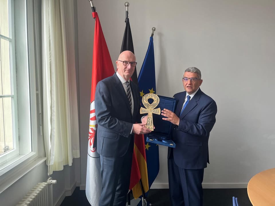 في اطار السعي نحو تعزيز العلاقات مع الولايات الفيدرالية الالمانية المختلفة، التقى السيد السفير د. محمد البدري، سفير جمهورية مصر العربية في ألمانيا و ديتمار فويدك، رئيس وزراء ولاية براندنبرج، حيث تم بحث سبل ترفيع التعاون بين مصر والولاية في شتى المجالات، ولاسيما في مجالات التعاون الاقتصادي وتعزيز التبادل التجاري، وكذلك في مجالات ادارة الموارد المائية وتحسين جودة الزراعة باستخدام التكنولوجيات الحديثة التي تتميز بها الولاية.