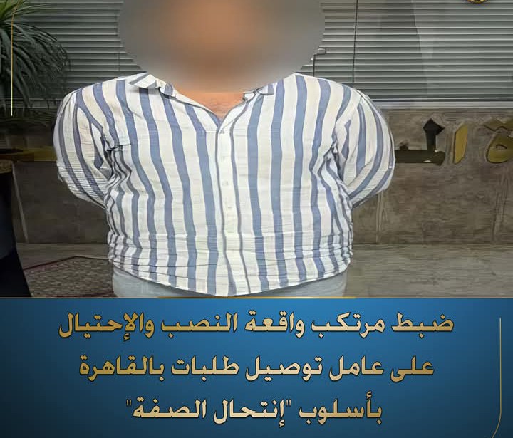 كشف ملابسات ما تبلغ للأجهزة الأمنية بمديرية أمن القاهرة من ( عامل توصيل طلبات ) بتضرره من قيام أحد الأشخاص بالنصب والإحتيال عليه والإستيلاء على مبلغ مالى منه بأسلوب “إنتحال_الصفة” حال قيامه بتوصيل طلبات بدائرة قسم شرطة التجمع الأول بالقاهرة ، وقرر بأنه لدى تواصله مع المشكو فى حقه للتأكد من العنوان طلب منه تحويل مبلغ مالى على “رقم هاتف محدد” عقب إيهامه بسداد المبلغ وقيمة الطلب لدى توصيل الطلبات لمحل عمله .. وعقب تحويله المبلغ المالى فوجىء بغلق الهاتف المحمول .