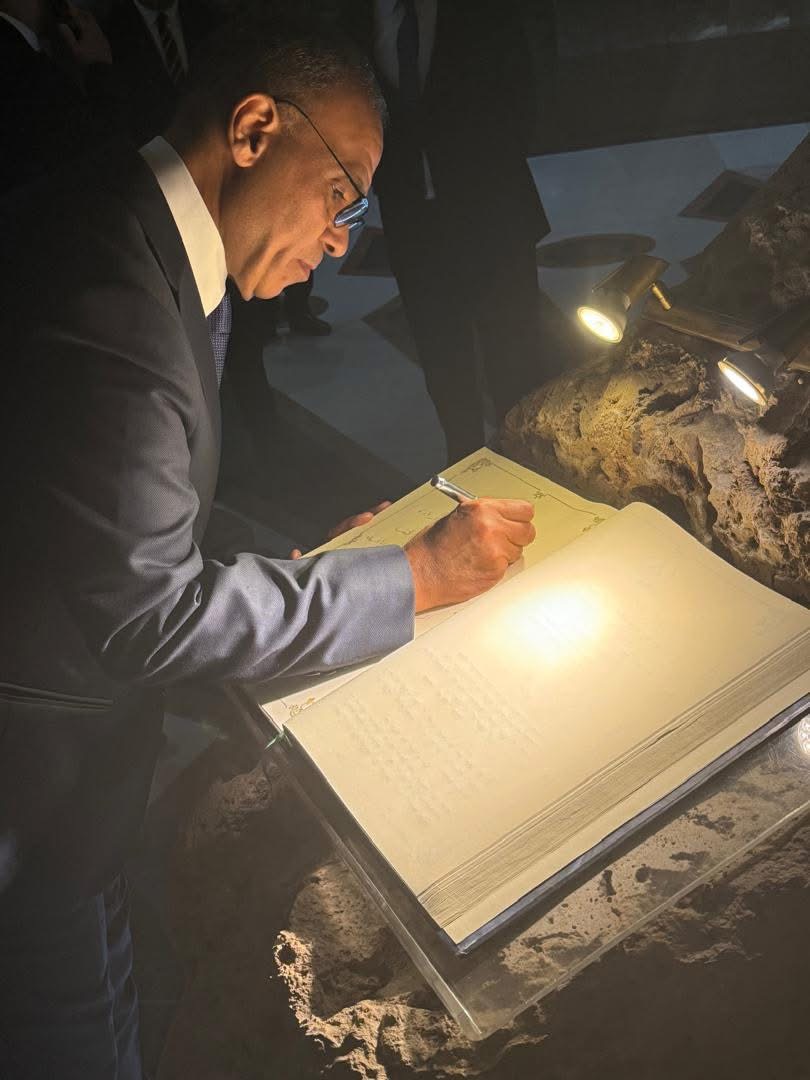 ويقوم بالتوقيع في السجل التذكاري الخاص بمتحف المجاهد.