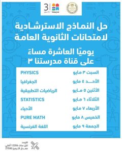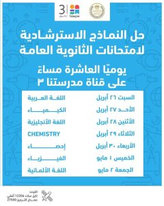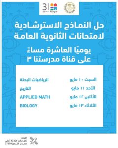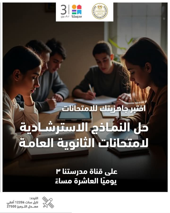 تقدم وزارة التربية والتعليم والتعليم الفني جدول مواعيد إتاحة النماذج الاسترشادية لامتحانات شهادة إتمام الثانوية العامة بداية من غدٍ السبت، وذلك عبر الموقع الرسمي للوزارة، كما يمكن متابعة حلها عبر قناة “مدرستنا ٣” يوميا فى تمام الساعة العاشرة مساء، على أن تكون الإعادة فى تمام الساعة العاشرة صباح اليوم التالي، وذلك عبر تردد القناة على النايل سات 12206 أُفقي معدل ترميز 27500.