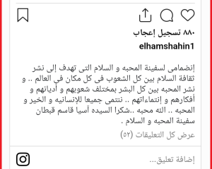 وعبر حسابها الرسمي على موقع “إنستجرام”، نشرت إلهام شاهين تدوينة أعربت فيها عن فخرها بهذه الخطوة، مؤكدة على أهمية نشر ثقافة السلام والمحبة بين جميع البشر، بغض النظر عن اختلافاتهم في الشعوب والأديان والأفكار والانتماءات، مشيرة إلى أن الإنسانية والخير والمحبة هي القيم التي تجمعنا جميعًا. واختتمت حديثها بتقديم الشكر للسيدة آسيا قاسم، قبطان سفينة المحبة والسلام.