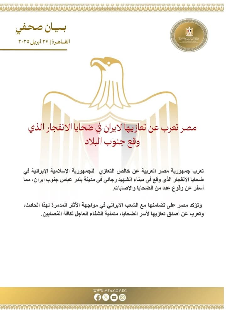 تعرب جمهورية مصر العربية عن خالص التعازي للجمهورية الإسلامية الإيرانية في ضحايا الانفجار الذي وقع في ميناء الشهيد رجائي في مدينة بندر عباس جنوب ايران، مما أسفر عن وقوع عدد من الضحايا والإصابات.