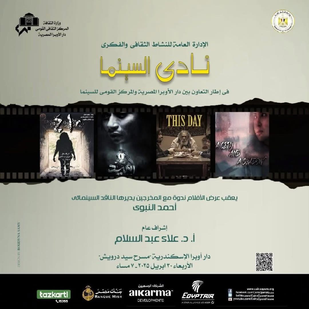فى إطار أنشطة وزارة الثقافة تواصل دار الأوبرا المصرية برئاسة الدكتور علاء عبد السلام ضمن نشاطها الثقافى والفكرى فعاليات نادى سينما أوبرا الإسكندرية بالتعاون مع المركز القومى للسينما حيث يعرض ٤ أفلام مصرية هى أميره وظل إخراج أحمد عثمان – هذا اليوم إخراج محمود صديق – أميد إخراج حسن الشريف – ٤١٠ إخراج حبيبه القبرصى وذلك فى السابعة مساء الأربعاء ٣٠ إبريل على مسرح سيد درويش ” أوبرا الإسكندرية ” ويعقبهم ندوة للمناقشة تستضيف مخرجى الأفلام المعروضة يديرها الناقد السينمائى أحمد النبوى .