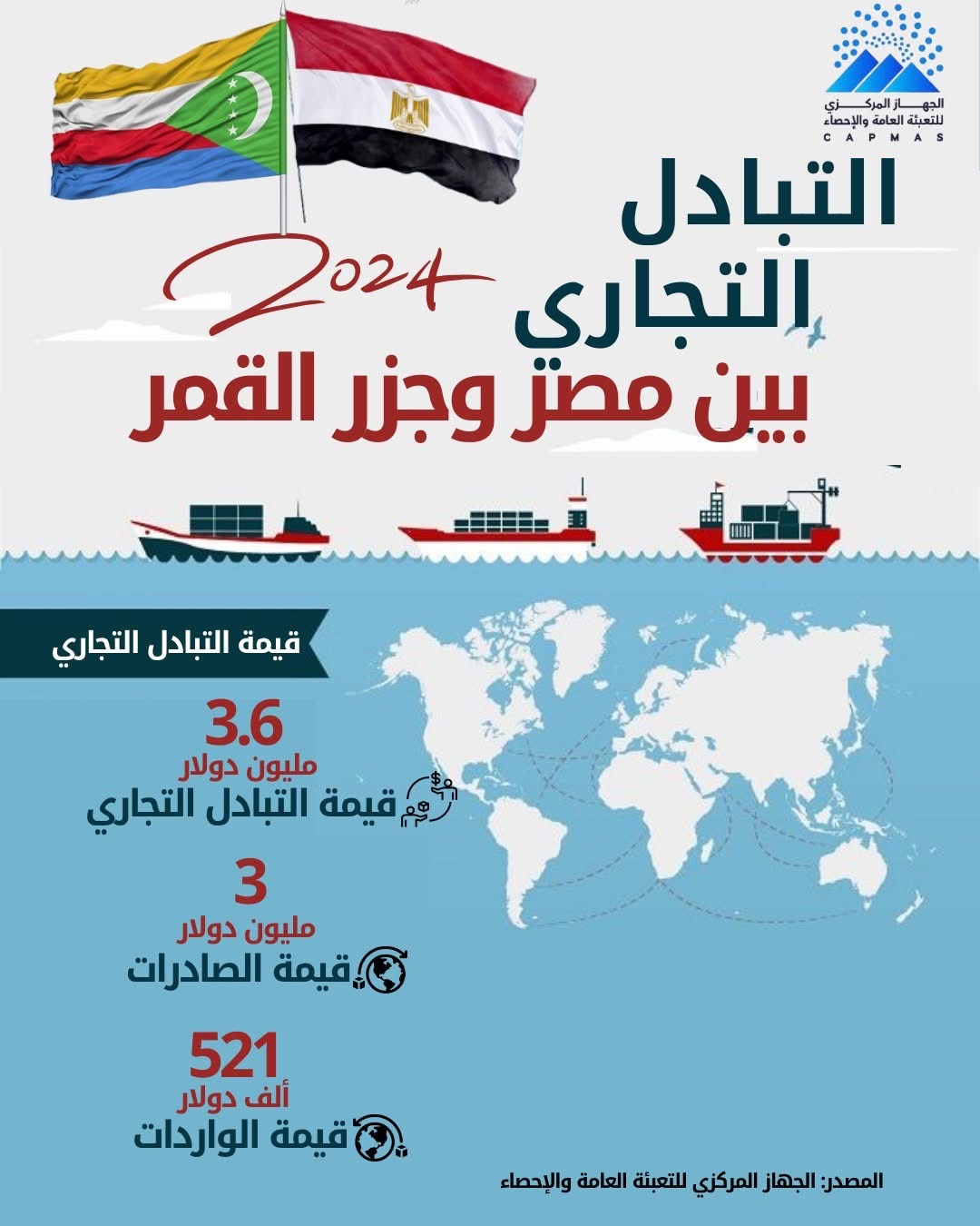 وأوضح البيان أن قيمة الصادرات المصرية لجزر القمر بلغت 3 ملايين دولار خلال عام 2024 مقابل 6.2 مليون دولار خلال عام 2023، بينما بلغت قيمة الواردات المصرية من جزر القمر 521 ألف دولار خلال عام 2024 مقابل 1.3 مليون دولار خلال عام 2023.