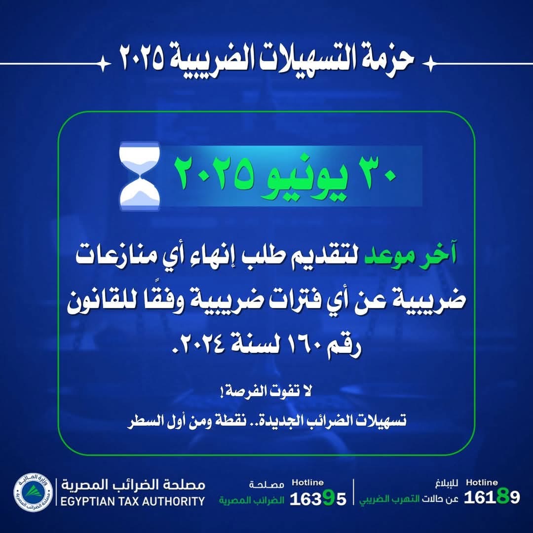 أصدرت مصلحة الضرائب المصرية ، اليوم الأربعاء توضح فيه أن 30 يونيو المقبل، آخر موعد لتقديم طلب إنهاء أية منازعات ضريبية عن أية فترات ضريبية، وفقًا للقانون رقم 160 لسنة 2024.