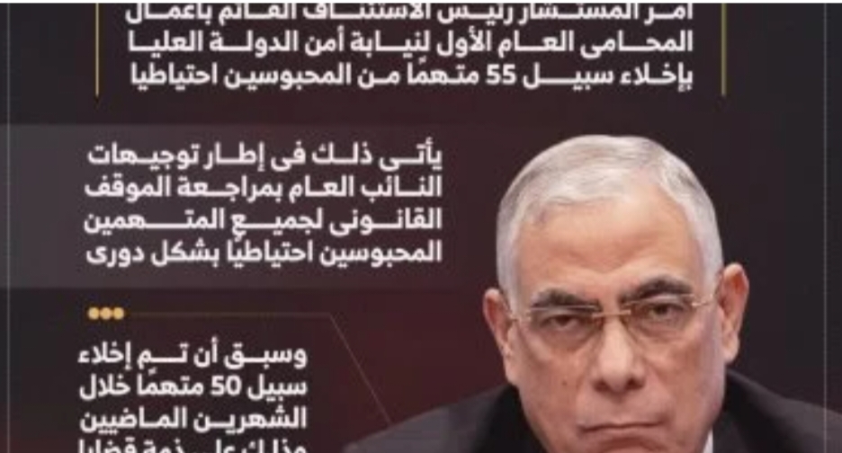 أمر المستشار رئيس الاستئناف القائم بأعمال المحامي العام الأول لنيابة أمن الدولة العليا بإخلاء سبيل 55 متهمًا، كما سبق أن تم إخلاء سبيل 50 متهمًا خلال الشهرين الماضيين، وذلك على ذمة قضايا تُجرِي تلك النيابة تحقيقات فيها.