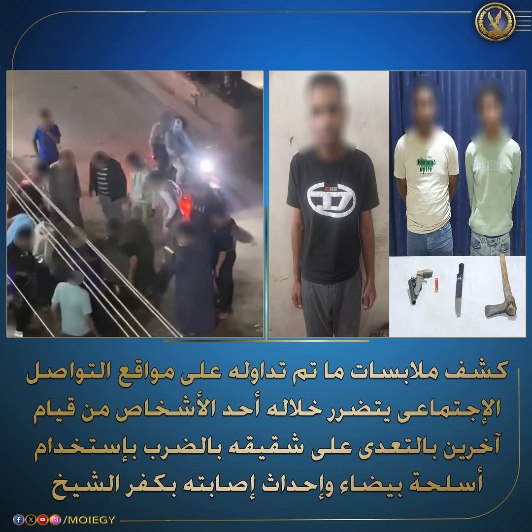 بالفحص تبين أنه بتاريخ 5 الجارى تبلغ لمركز شرطة كفر_الشيخ من إحدى المستشفيات بإستقبالها شقيق الشاكى (عامل “مصاب بجرح قطعى بالصدر” ومحجوز بالمستشفى لتلقى العلاج) إثر تعدى من آخرين.. وتبين حدوث مشاجرة بين طرف أول: (المصاب “له معلومات جنائية”) ، طرف ثانى: (4 أشخاص “أحدهم مصاب بجروح قطعية ومحجوز بإحدى المستشفيات لتلقى العلاج”).. وأمكن ضبط باقى أطراف المشاجرة وبحوزتهم الأسلحة المستخدمة فى الواقعة وإعترفوا بحدوث المشاجرة لخلافات مالية بينهم.