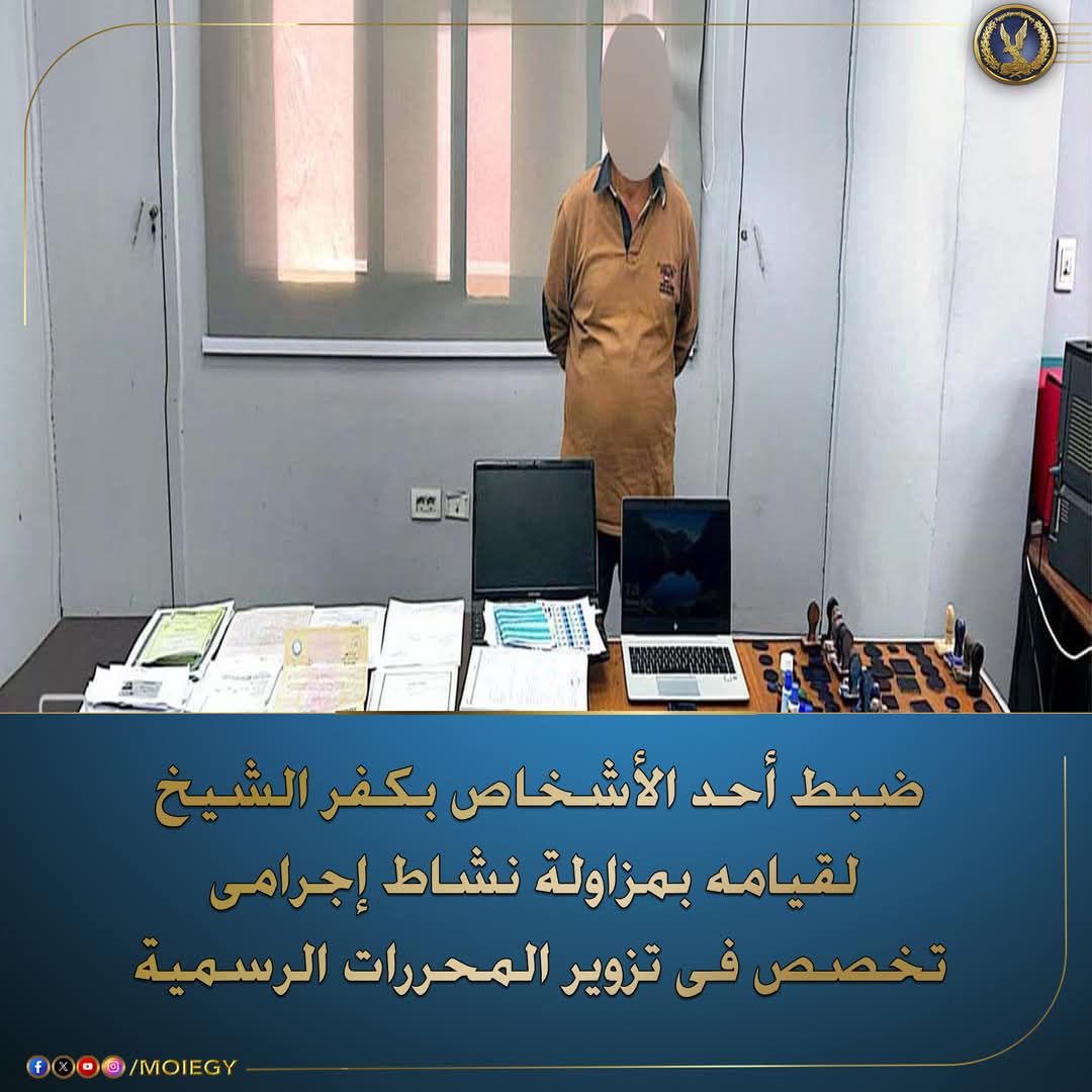 أكدت معلومات وتحريات قطاع الأمن العام بالتنسيق مع أجهزة الوزارة المعنية قيام (أحد الأشخاص – مقيم بدائرة قسم شرطة أول كفر الشيخ) بمزاولة نشاط إجرامى تخصص فـى تزوير المحررات الرسمية نظير مبالغ مالية ، متخذاً من محل سكنه مسرحاً لممارسة نشاطه الإجرامى.