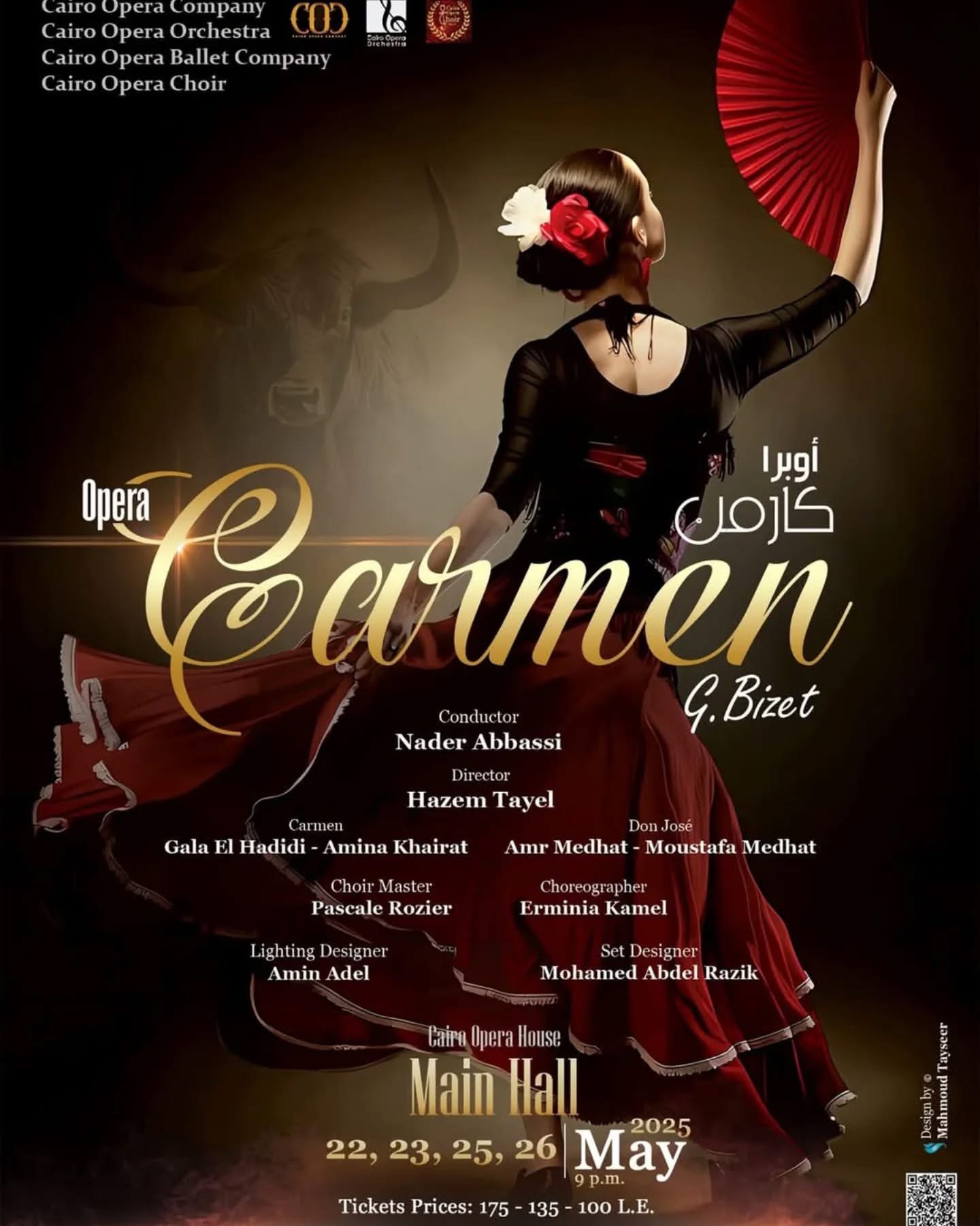ضمن فعاليات وزارة الثقافة تقدم دار الأوبرا المصرية برئاسة الدكتور علاء عبد السلام رائعة المؤلف الموسيقى الفرنسى جورج بيزيه “أوبرا كارمن” لفرقة أوبرا القاهرة إشراف فنى للدكتورة منى رفلة بمصاحبة أوركسترا أوبرا القاهرة بقيادة المايسترو نادر عباسى وفرقة باليه أوبرا القاهرة تحت إشراف مديرها الفنى ومصممة الرقصات أرمينيا كامل وكورال أوبرا القاهرة تدريب باسكال روزيه ومن إخراج حازم طايل أربعة أيام تبدأ التاسعة مساء الخميس ، الجمعة ، الأحد ، الأثنين ٢٢ ، ٢٣ ، ٢٥ ، ٢٦ مايو على المسرح الكبير .
