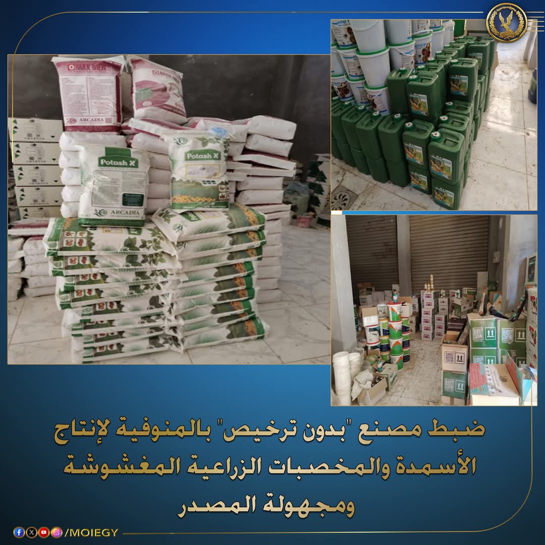 أكدت معلومات وتحريات قطاع الأمن العام بمشاركة مديرية أمن #المنوفية والأجهزة المعنية قيام (مالك مصنع لإنتاج وتصنيع الأسمدة والمخصبات الزراعية “بدون ترخيص” – كائن بدائرة مركز شرطة الباجور بالمنوفية) بحيازة وتصنيع كمية من الأسمدة والمخصبات الزراعية مجهولة المصدر وطرحها بالأسواق لتحقيق أرباح غير مشروعة.