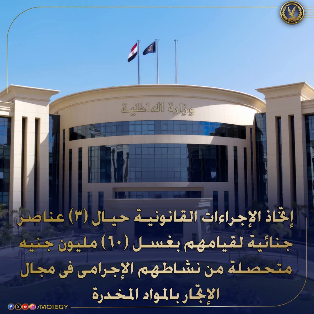 إستمراراً لجهود مكافحة جرائم غسل الأموال وتتبع ثروات ذوى الأنشطة الإجرامية وحصر ورصد ممتلكاتهم وإتخاذ الإجراءات القانونية حيالهم .. فقد إضطلع قطاع مكافحة المخدرات والأسلحة والذخائر غير المرخصة بالتنسيق مع أجهزة الوزارة المعنية بإتخاذ الإجراءات القانونية حيال (3 عناصر جنائية – مقيمين بمحافظة #المنوفية) لقيامهم بغسل الأموال المتحصلة من نشاطهم الإجرامى فى الإتجار بالمواد المخدرة ومحاولتهم إخفاء مصدرها وإصباغها بالصبغة الشرعية وإظهارها وكأنها ناتجة عن كيانات مشروعة عن طريق (شراء العقارات والأراضى) .