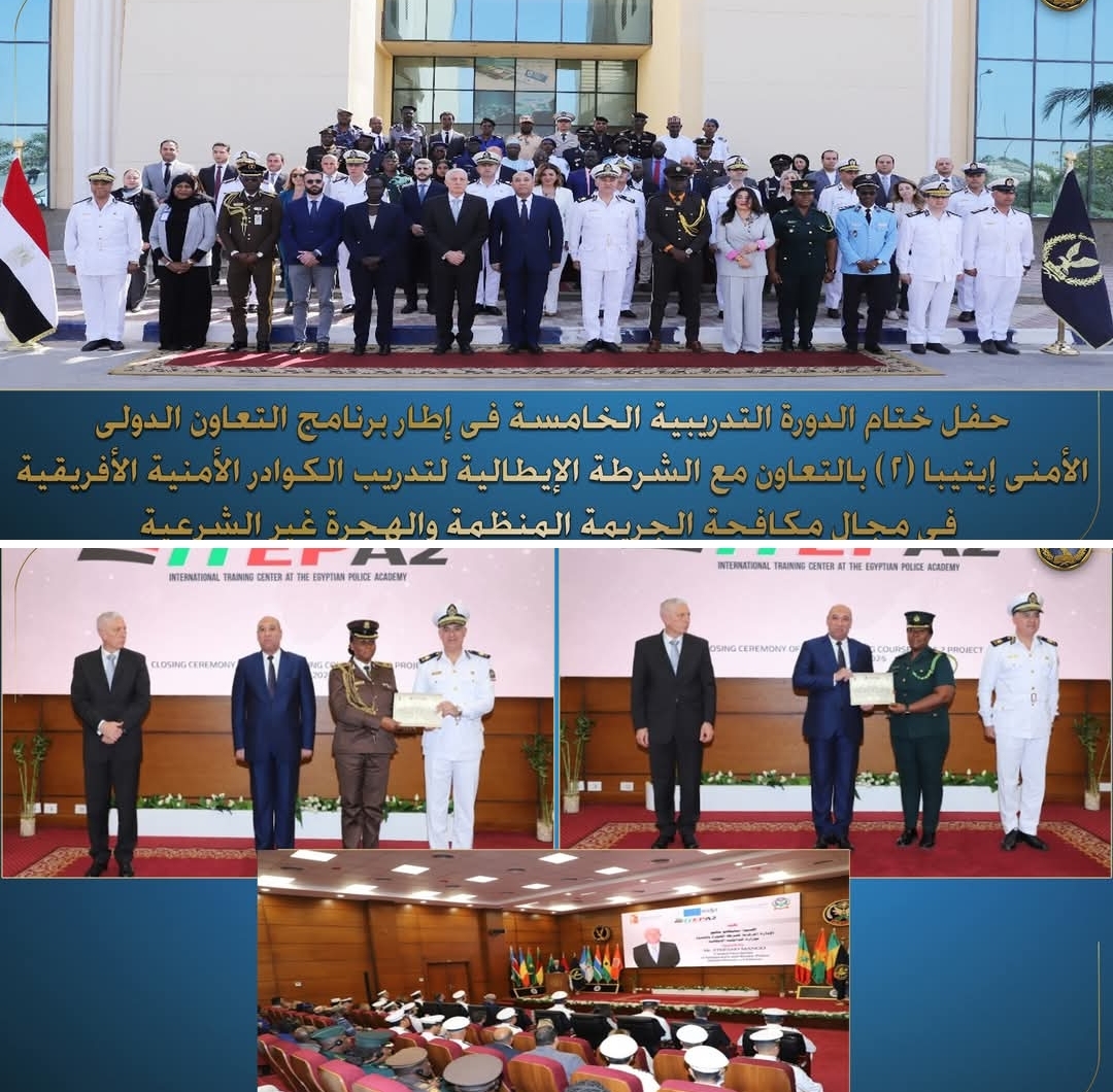 نظمت أكاديمية الشرطة “مركز بحوث الشرطة” حفل ختام الدورة التدريبية الخامسة للمرحلة الثانية من البرنامج التدريبى المقرر عقده خلال عامى 2024-2025م لتدريب الكوادر الأمنية الأفريقية فى مجال مكافحة الجريمة المنظمة والهجرة غير الشرعية بمقر مركز بحوث الشرطة وذلك وفقاً لبروتوكول التعاون الأمنى السابق توقيعه بين أكاديمية الشرطة المصرية وإدارة شرطة الحدود بوزارة الداخلية الإيطالية حيث شارك بتلك الدورة التدريبية عدد (44) متدرباً من الكوادر الأمنية الأفريقية يمثلون عدد (20) دولة أفريقية خلال الفترة من 26/4 وحتى 22-5-2025م.