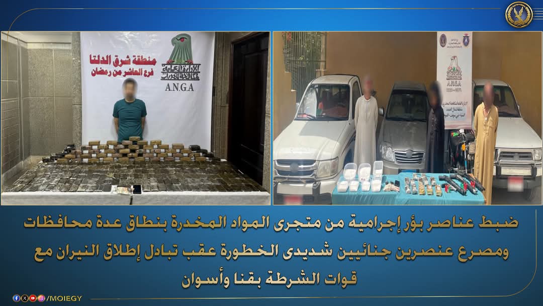 فى إطار مواصلة وزارة الداخلية توجيه الضربات الإستباقية للبؤر الإجرامية جالبى المواد المخدرة وحائزى الأسلحة النارية غير المرخصة.. فقد أكدت معلومات وتحريات قطاعى “الأمن العام – مكافحة المخدرات والأسلحة والذخائر غير المرخصة” بالتنسيق مع أجهزة الوزارة المعنية قيام بؤر إجرامية تضم (عناصر جنائية شديدة الخطورة) بمحاولة جلب كميات من المواد المخدرة تمهيداً للإتجار بها ، وحيازة أسلحة نارية وذخائر غير مرخصة بنطاق عدة محافظات.