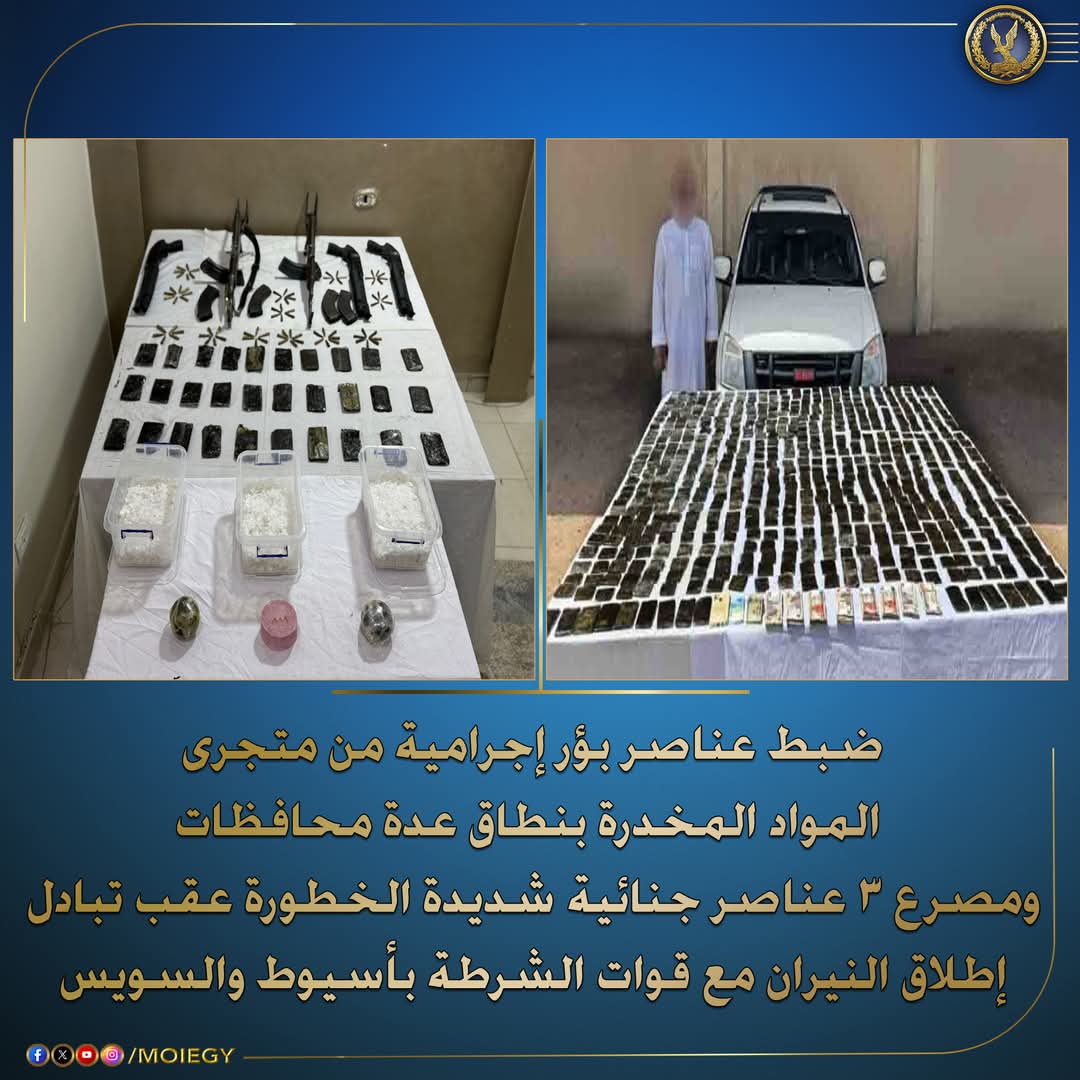 أكدت معلومات وتحريات قطاعى “الأمن العام – مكافحة_المخدرات والأسلحة والذخائر غير المرخصة” بالتنسيق مع أجهزة الوزارة المعنية قيام بؤر إجرامية تضم (عناصر جنائية شديدة_الخطورة) بمحاولة جلب كميات من المواد المخدرة تمهيداً للإتجار بها ، وحيازة أسلحة نارية وذخائر غير مرخصة بنطاق عدة محافظات.
