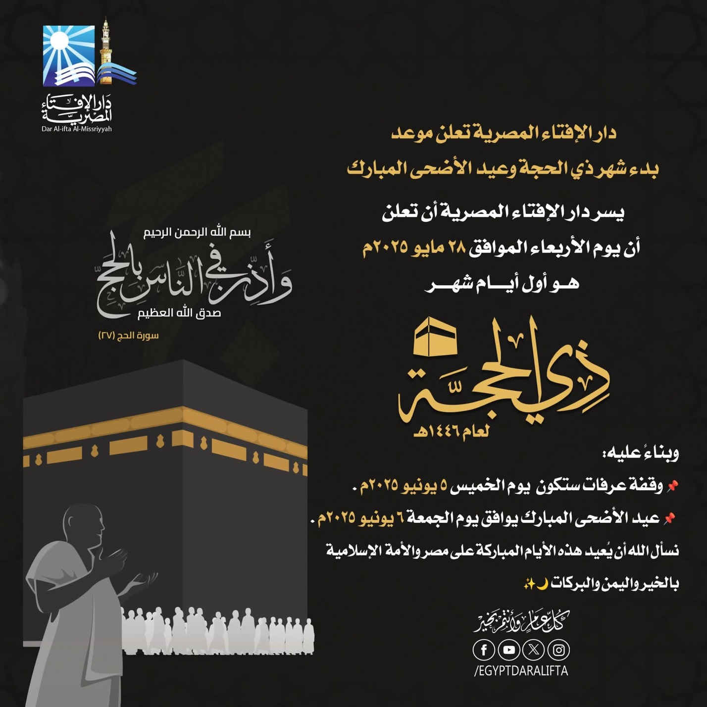 وعلى ذلك تُعلن دارُ الإفتاءِ المصريةُ أن يومَ الأربعاء الموافق الثامن والعشرين من شهر مايو لعام ألفين وخمسة وعشرين ميلاديًّا هو أول أيام شهر ذي الحجة لعام ألفٍ وأربعمائةٍ وستة وأربعين هجريًّا.