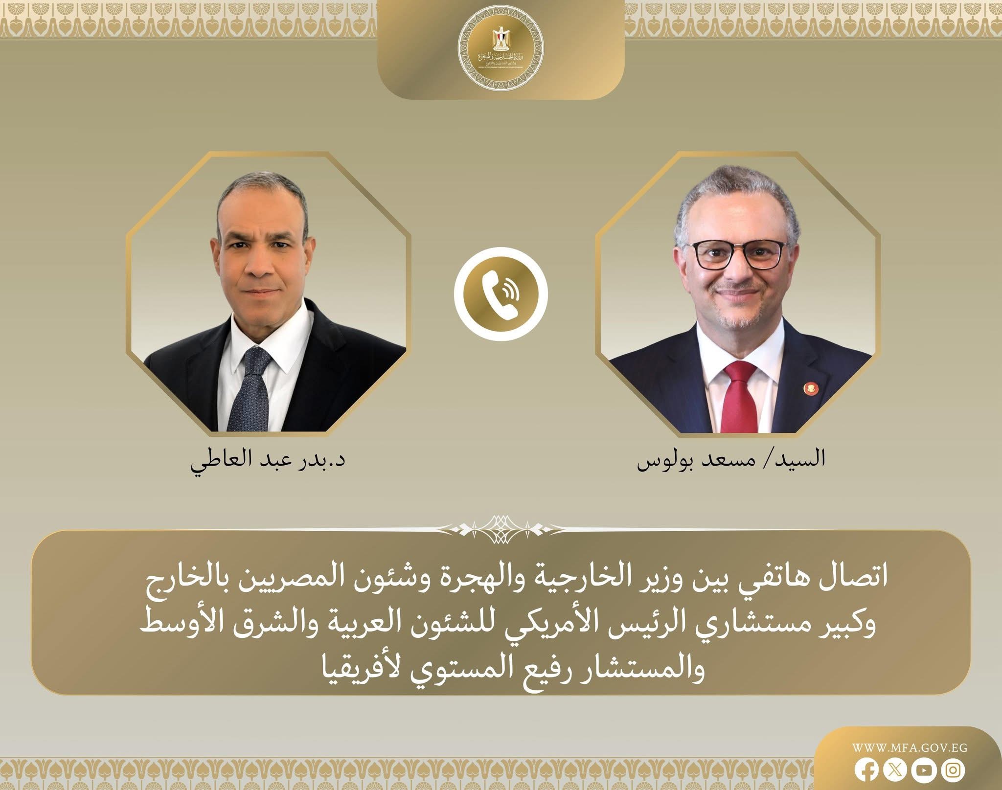 تلقي د. بدر عبد التعاطى وزير الخارجية والهجرة مساء يوم الاحد الاول من يونيو اتصالا هاتفيا من السيد “مسعد بولس” كبير مستشاري الرئيس الأمريكي للشئون العربية والشرق الأوسط والمستشار رفيع المستوي لأفريقيا، حيث اعرب بولس عن تقديره البالغ لتفضل السيد الرئيس باستقباله خلال زيارته الأخيرة للقاهرة والتي كانت زيارة ايجابية ومثمرة وتعكس عمق العلاقات بين البلدين الصديقين.